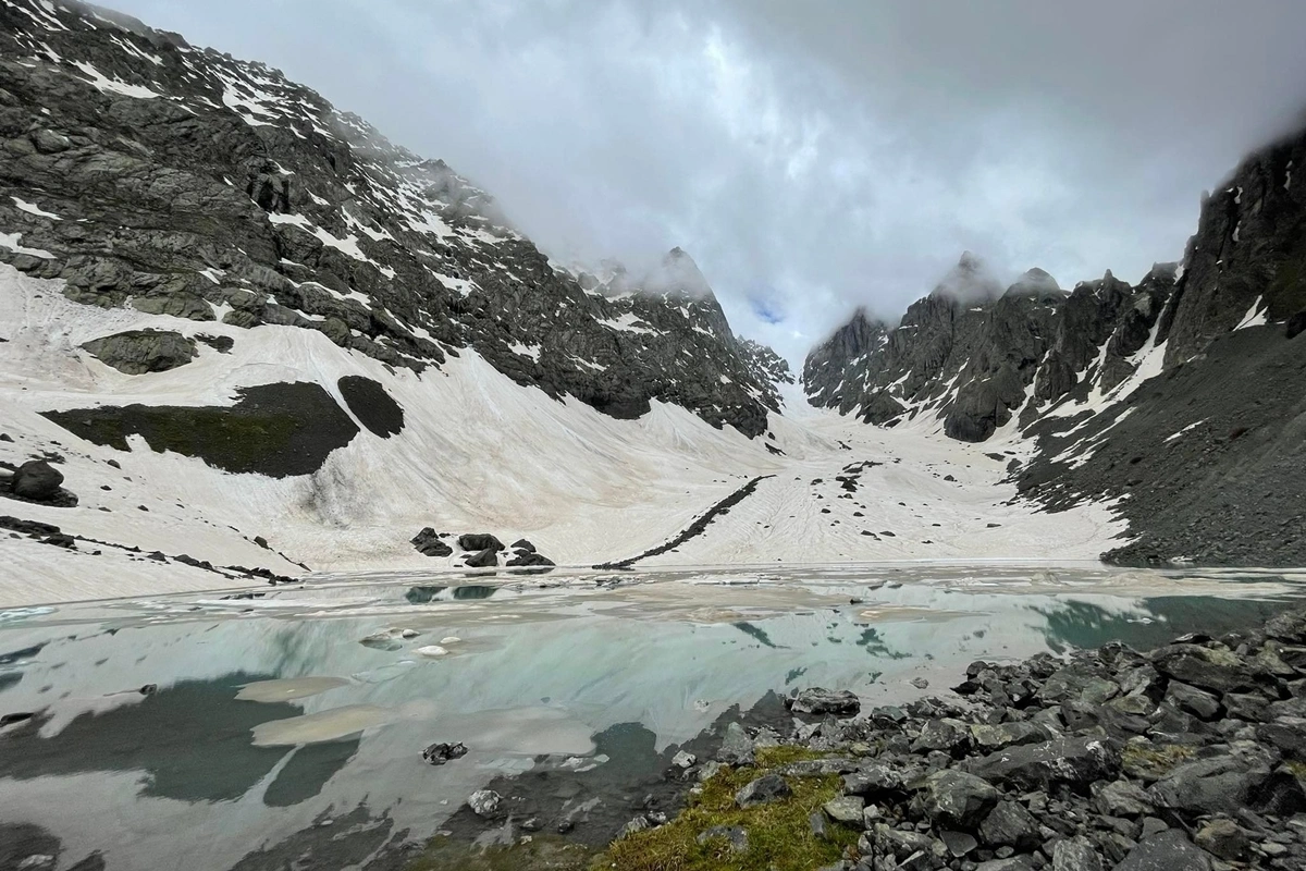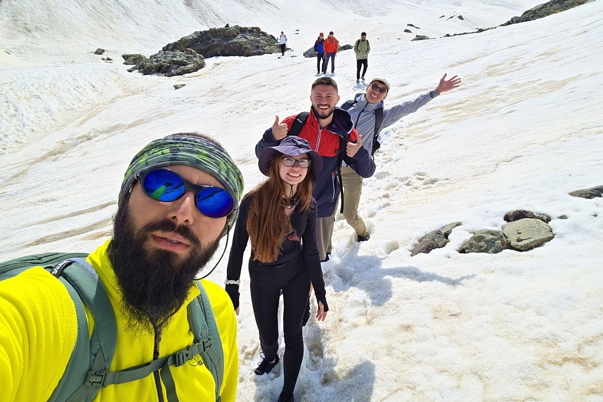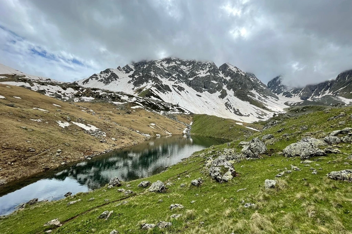 The hike to Abudelauri Lakes starts from the small village of Roshka, located about 3 hours' drive from Tbilisi. From Roshka, the trail gradually ascends through alpine meadows and rocky terrain, following a visible footpath surrounded by mountain peaks. The distance from Roshka to the lakes is approximately 4 kilometers one way, and the hike takes around 1.5 to 2 hours to reach the lakes, depending on pace. The trail is moderate in difficulty, with a few steeper sections but no technical climbing required. Along the way, you’ll enjoy views of the Chaukhi massif and wide open landscapes. At the end of the trail, you’ll find the three Abudelauri Lakes, each with its distinct color: green, blue, and milky white. After spending time at the lakes, the return hike follows the same path back to Roshka.
